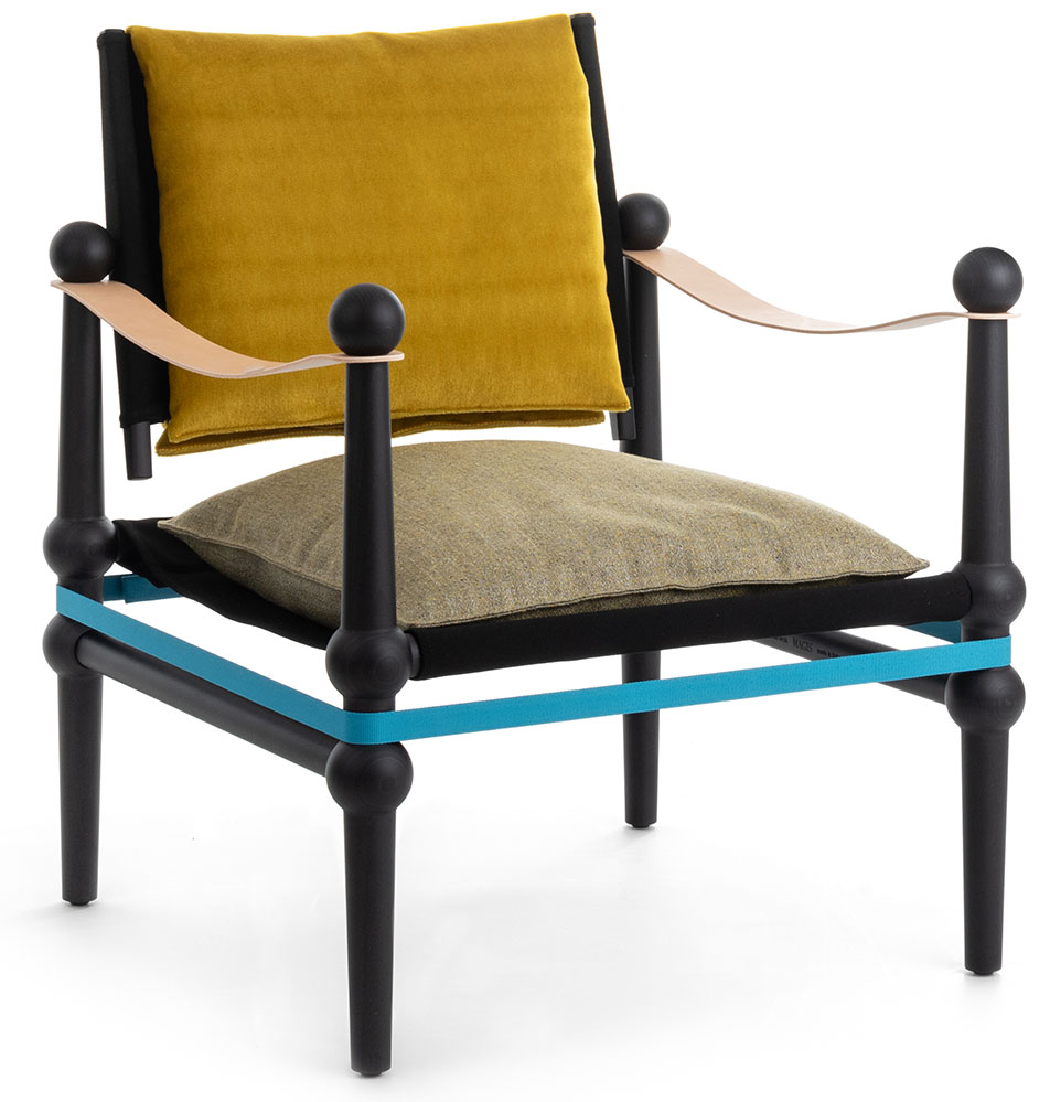 Der von dem Safari Chair inspirierte Twain Chair von Konstantin Grcic entstand in den Jahren 2023/24 und ist mit einem Gestell aus massiven, naturbelassenen oder schwarz gebeizten Buchenholzspindeln bei Magis erhältlich. Dabei ist die Variante in schwarzer Buche in folgenden drei abgestimmten Materialkompositionen erhältlich: