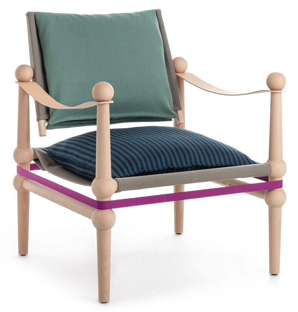 Der von einem Safari Chair inspirierte Twain Chair von Konstantin Grcic entstand in den Jahren 2023/24 und ist mit einem Gestell aus massiven, naturbelassenen oder schwarz gebeizten Buchenholzspindeln bei Magis erhältlich. Dabei ist die Variante in Buche natur in drei abgestimmten Materialkompositionen erhältlich: