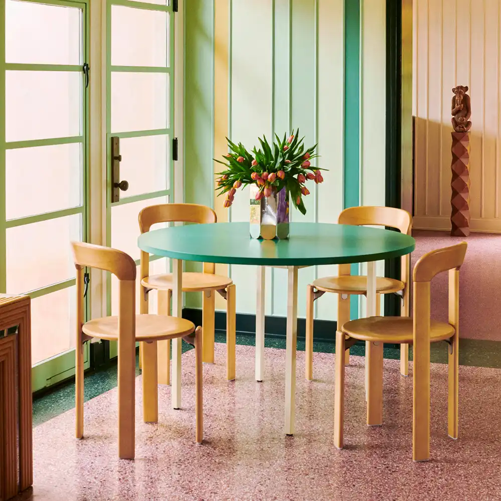 Die gleichmäßige Materialstärke beider Komponenten erzeugt eine harmonische Silhouette, die durch den gezielten Einsatz kontrastierender Farben visuell aufgebrochen wird. Der Tisch ist in zwei Durchmessern erhältlich – 105 cm und 120 cm – und eignet sich sowohl für kompakte Räume als auch für großzügige Umgebungen. Mit sechs Farbkombinationen bietet der Two-Colour Table Round vielfältige Gestaltungsmöglichkeiten, die von subtil bis expressiv reichen