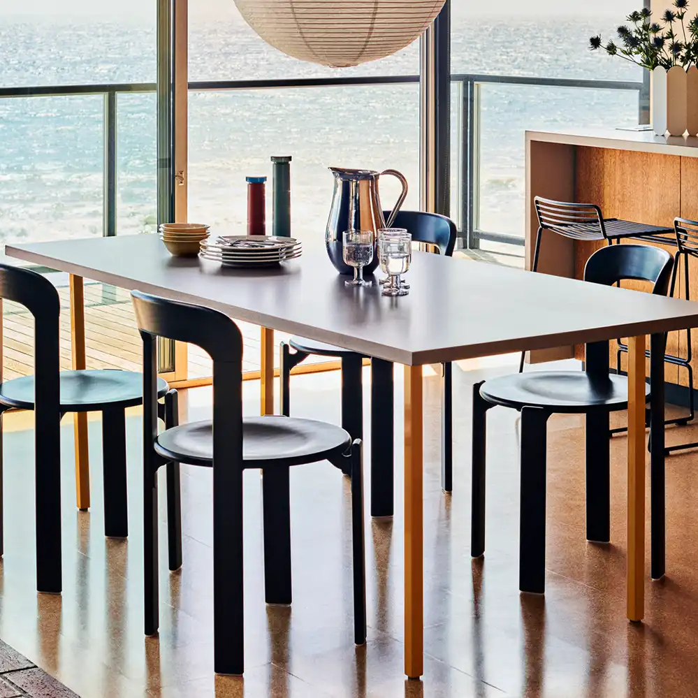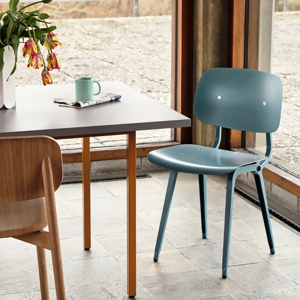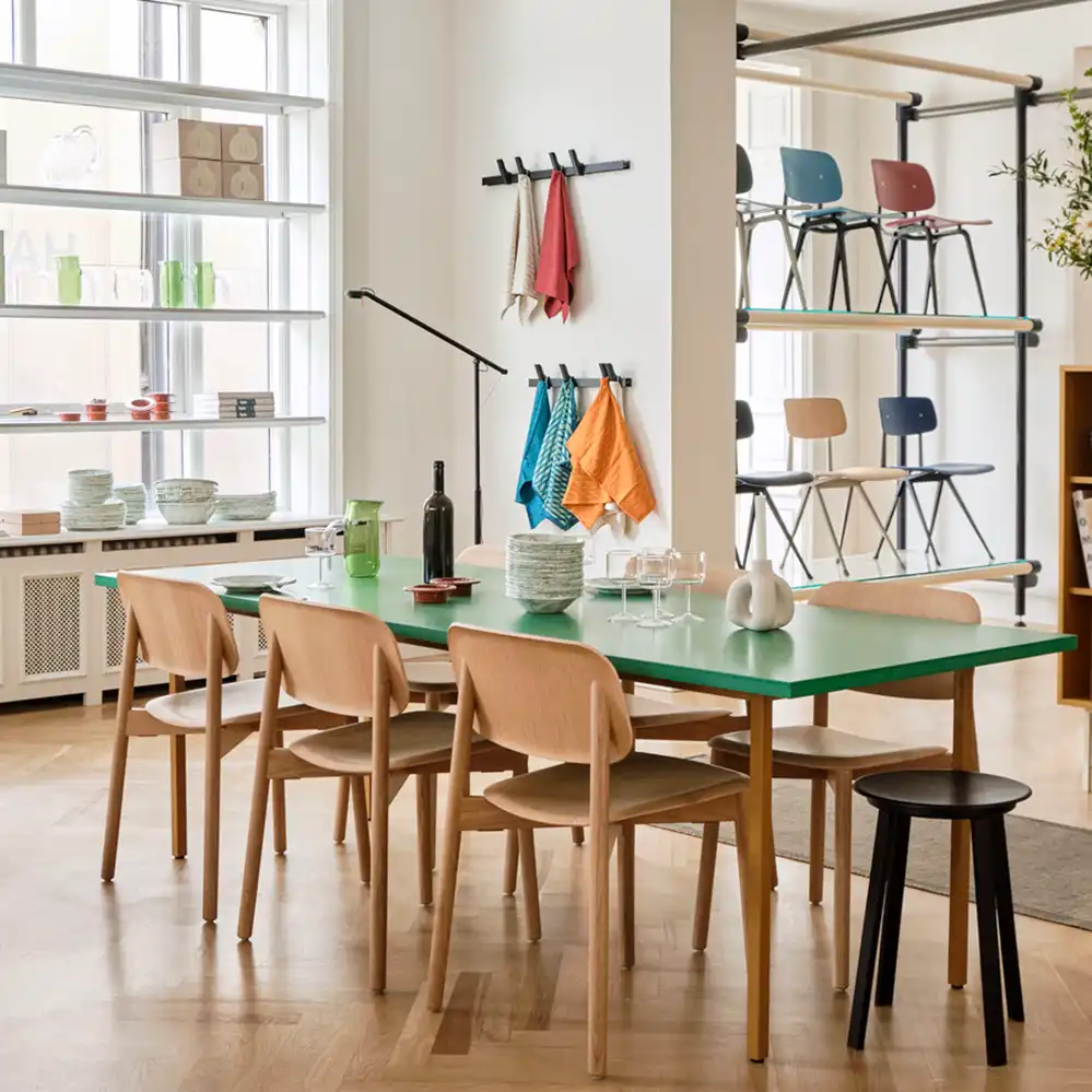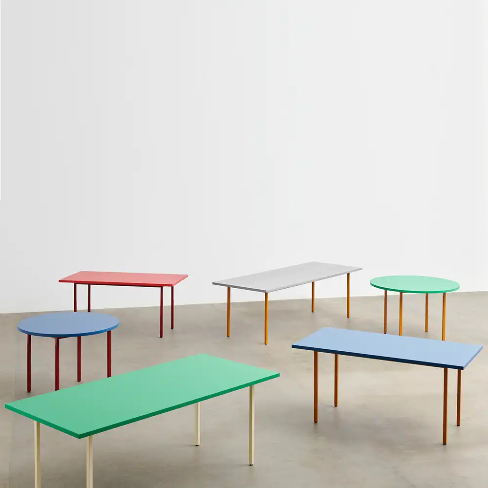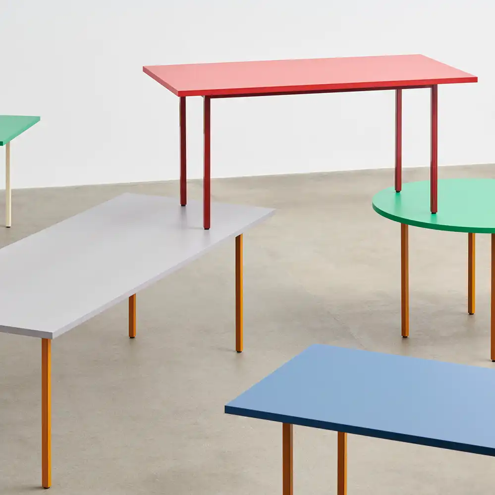 Die Tischplatte besteht aus organisch gefärbtem Valchromat, einem robusten, FSC-zertifizierten MDF-Material mit wasserbasierter Lackierung, das durch seine matte Oberfläche und intensive Farbwirkung überzeugt. Das Gestell aus pulverbeschichtetem Stahlrohr sorgt für Stabilität und Leichtigkeit. Beide Elemente sind in gleichmäßiger Materialstärke ausgeführt und bilden eine harmonische, grafische Silhouette.Der Tisch ist in drei Größen erhältlich – 160 cm, 200 cm und 240 cm Länge – und bietet damit flexible Einsatzmöglichkeiten für Essbereiche, Arbeitsplätze oder öffentliche Räume. Die sechs Farbkombinationen reichen von subtilen Ton-in-Ton-Varianten bis hin zu kontrastreichen Kompositionen, die jedem Raum eine individuelle Note verleihen.