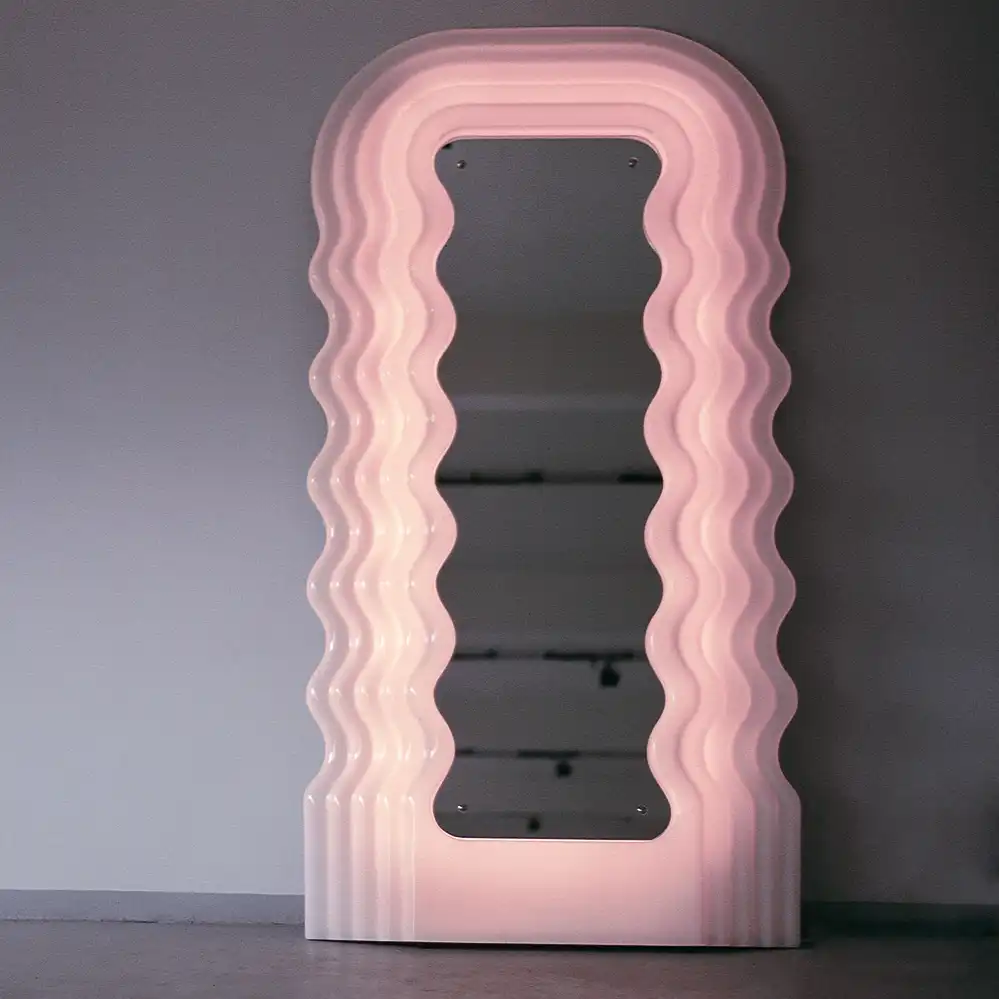 Der Spiegel ist im ausgeschalteten Zustand weiß, eingeschaltet leuchtet Ultrafragola neonpink.