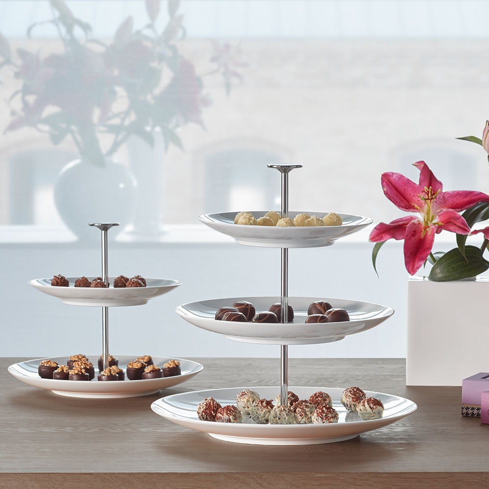 - Maße: Etagere 2stöckig Durchmesser 25 cm, Höhe 19 cm, Etagere 3stöckig Durchmesser 30 cm, Höhe 31 cm
