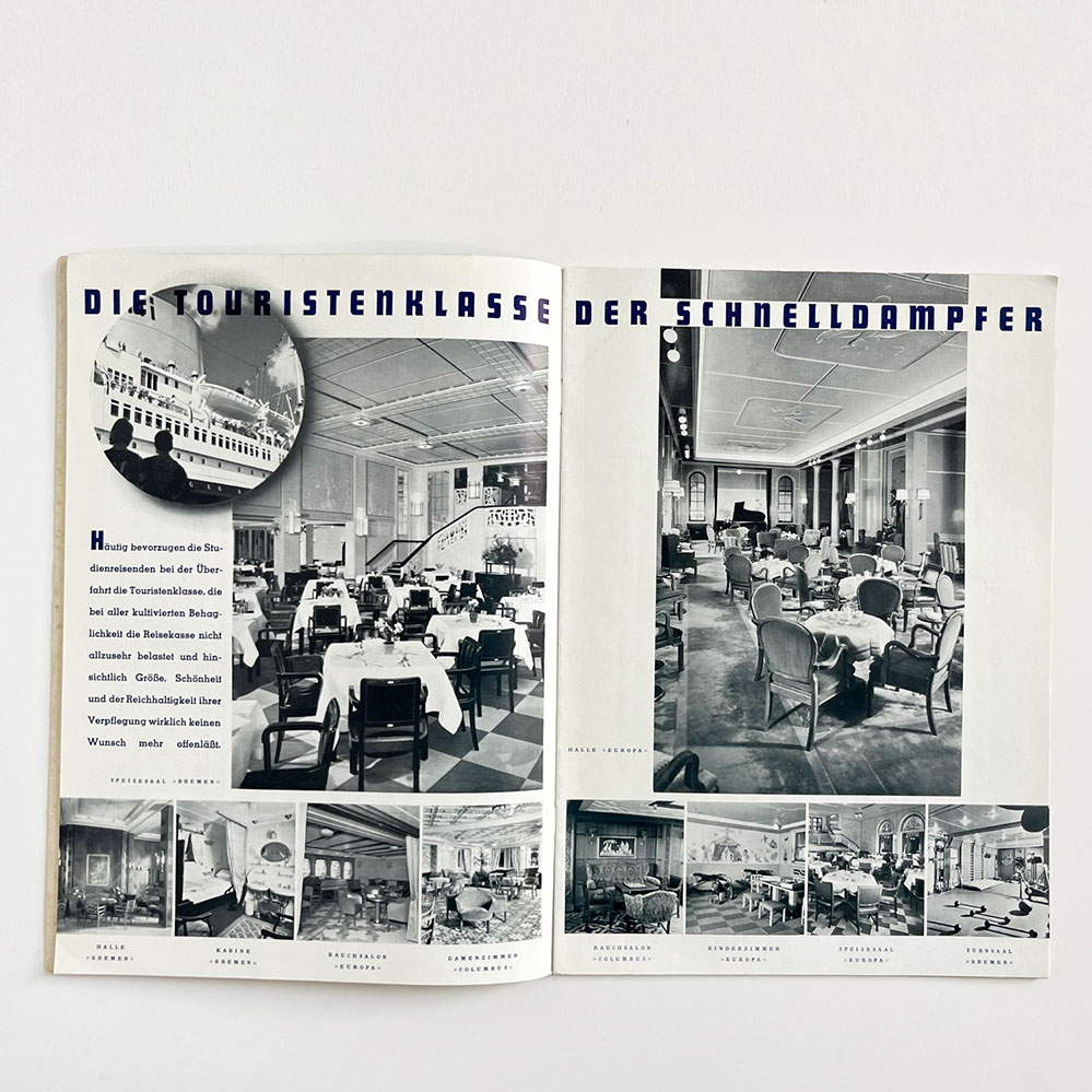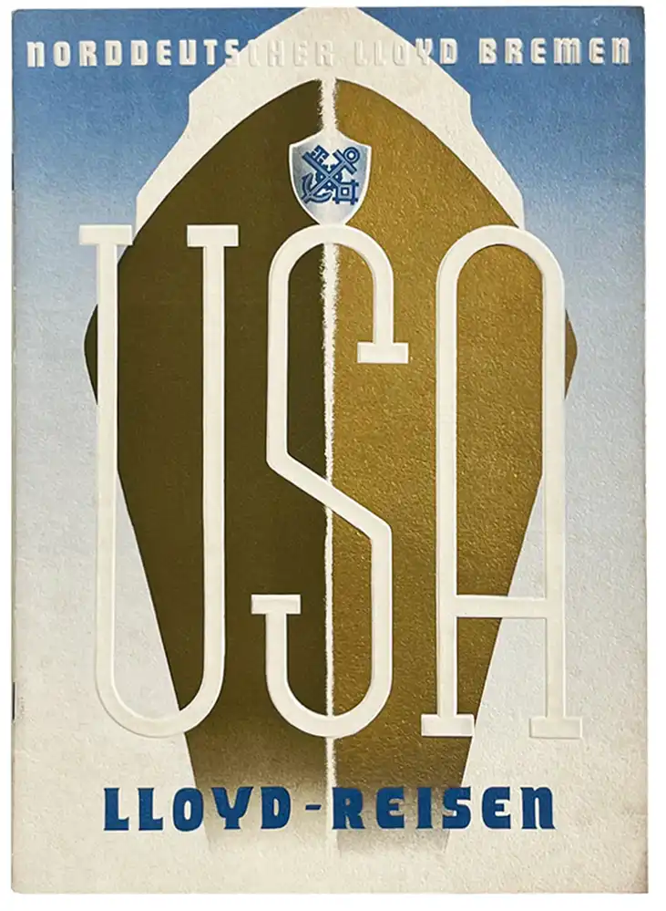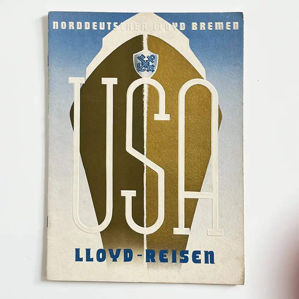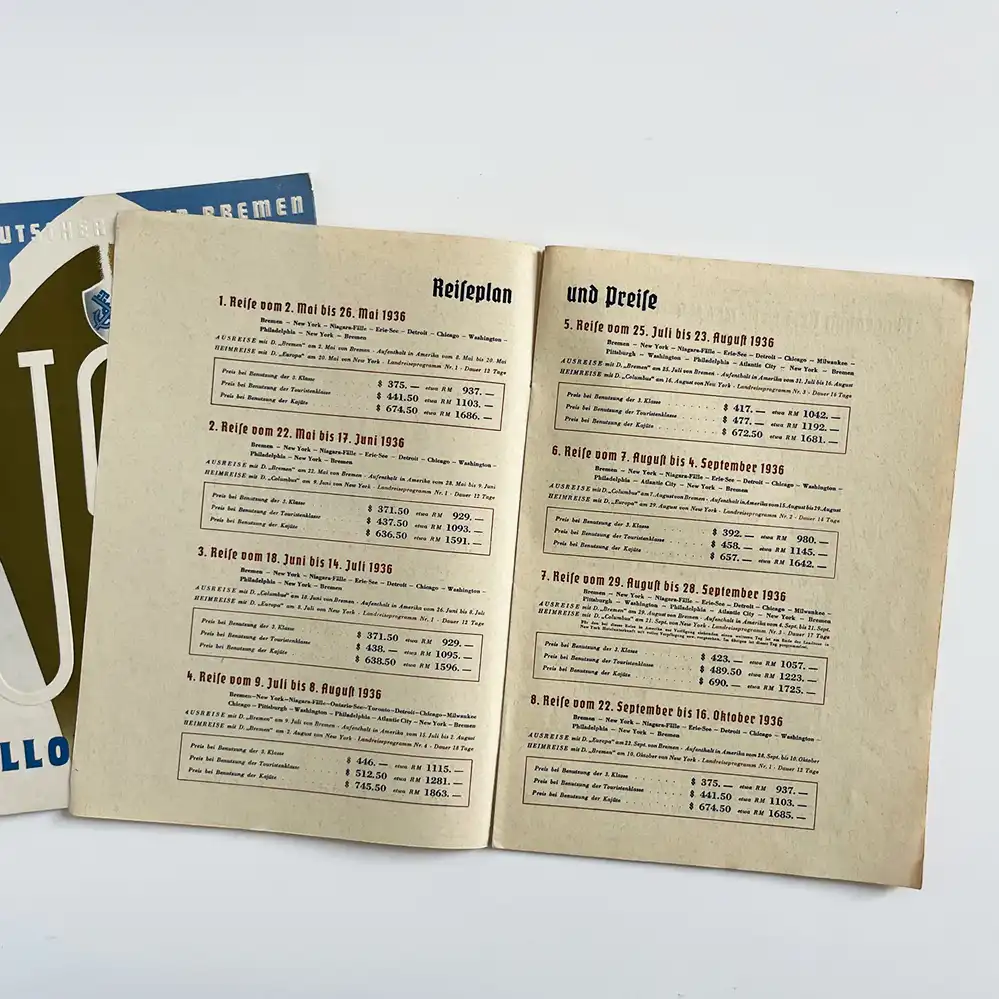 Der 1936 erschienene Werbeprospekt der Norddeutschen Lloyd Bremen überzeugt durch das hochwertige Cover im Stil des Art deco, noch mit Blindprägung und Golddruck. Beworben wurden die USA-Fahrten der damaligen deutschen Luxus-Passagierschiffe Bremen, Colombus und Europa. Lieferung inklusive originaler Preisliste aus dem Jahr 1936 und Reiseplan.