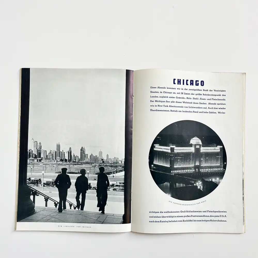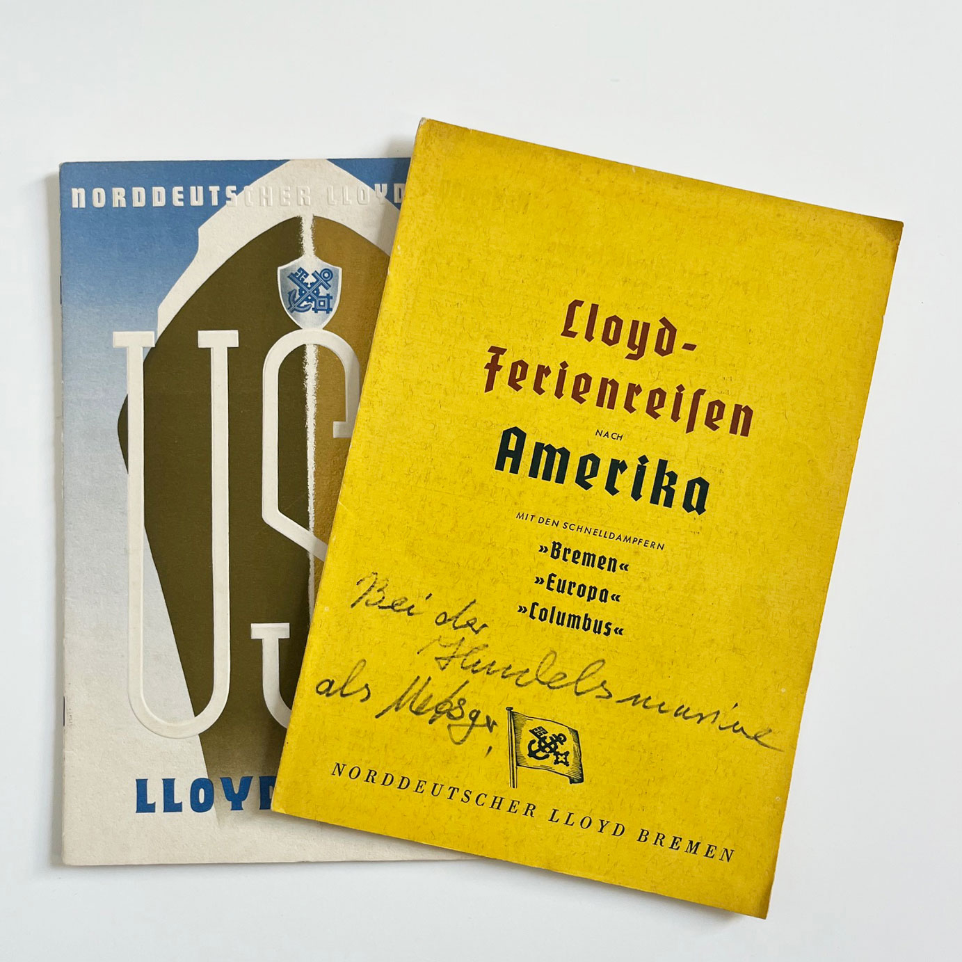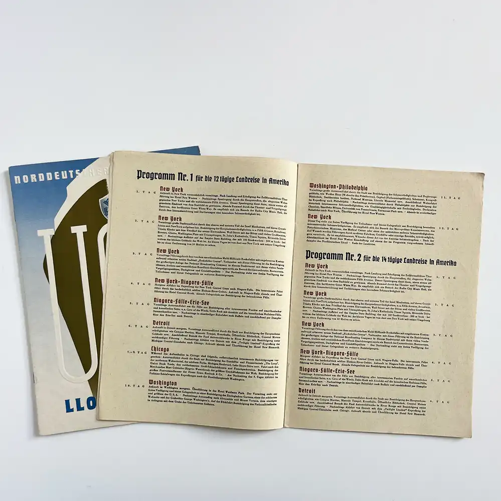 Der 1936 erschienene Werbeprospekt der Norddeutschen Lloyd Bremen überzeugt durch das hochwertige Cover im Stil des Art deco, noch mit Blindprägung und Golddruck. Beworben wurden die USA-Fahrten der damaligen deutschen Luxus-Passagierschiffe Bremen, Colombus und Europa. Lieferung inklusive originaler Preisliste aus dem Jahr 1936 und Reiseplan.