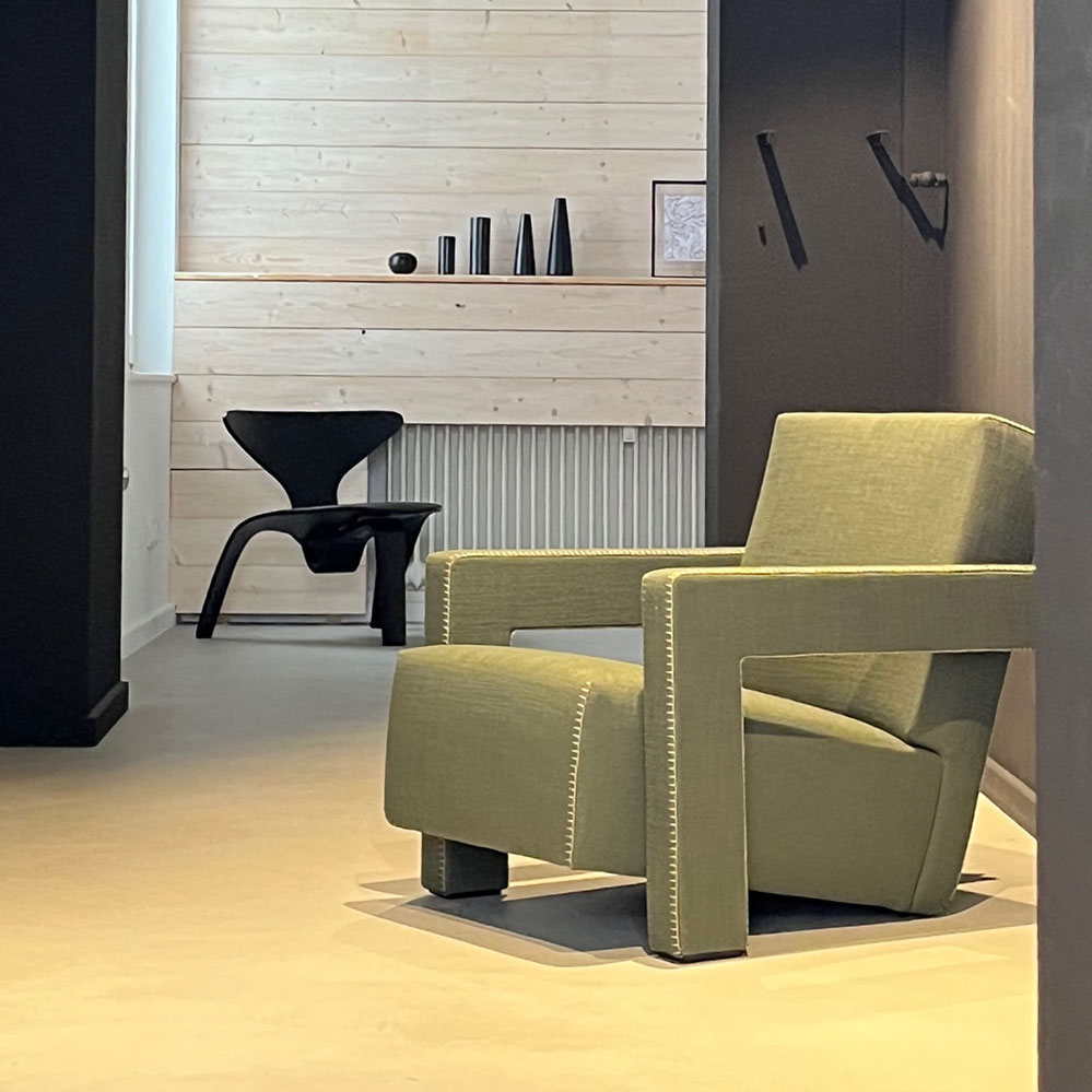 Den Utrecht Chair (oder Uetrecht Chair) und das gleichnamige Sofa entwarf der niederländische Architekt Gerrit Rietveld 1935, die ursprüngliche Version wurde von Metz & Co. in Amsterdam hergestellt. Schon damals verfügte der kleine Sessel über die typische Kontrastnaht (Zick-Zack-Stich) als ein Designmerkmal. Auch die heutige Edition von Cassina beinhaltet diese typische Naht an den Armlehnen. Die bei Markanto angebotene Ausführung umfasst den Stoff Eremo der Preisgruppe E von Cassina, selbstverständlich ist der Utrecht Sessel auch in anderen Stoffen und in Leder erhältlich. Stoff- und Ledermuster senden wir Ihnen gerne zu. Seit 2016 ist der Utrecht Sessel bei Cassina in der größeren XL-Variante möglich (siehe letzte Abbildung), fragen Sie uns nach Details.