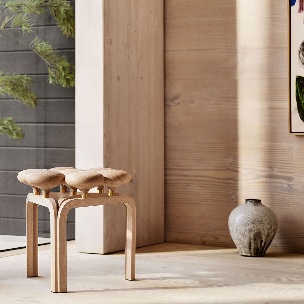 Fast wie ein Kunstwerk wirkt der Hocker des dänischen Architekten Jörn Utzon mit seinen sieben Knöpfen aus massiver Buche. Das Gestell des Hockers besteht aus drei Beinen, die jeweils aus 17 Lagen 2 mm starkem Buchenfurnier gefertigt werden. Alle Lagen sind in der gleichen Maserungsrichtung angeordnet, um ein gleichmäßiges Aussehen zu erzielen, die Metallapplikationen sind aus unbehandeltem Messing.