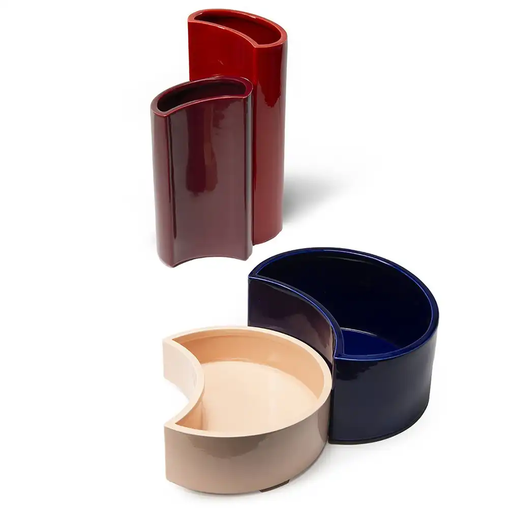 V-Bol 9562 ist eine Vase mit mondförmiger Silhouette, entworfen von Zaven für Zanotta. Sie ist in zwei Höhen erhältlich – 29 cm und 37 cm – und wird in den Farben Dunkelblau, Dunkelrot, Rot und Rosa angeboten. Die klare Formgebung und die präzise Ausführung spiegeln den analytischen Designansatz des Studios wider. Die V-Bowl eignet sich sowohl als funktionales Gefäß als auch als dekoratives Objekt im Wohnbereich.