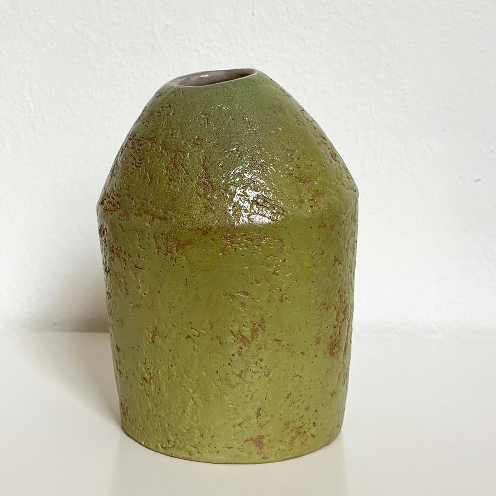 Die grün glasierte Vase von Martin Goerg überzeugt nicht nur durch ihre Formgebung, sondern besonders durch die fast dreidimensional wirkende Oberflächenstruktur, die bei salzglasiertem Steinzeug entsteht. Bei dieser besonders robusten und widerstandsfähigen Gasur, die in dem Töpferort Höhr-Grenzhausen seit dem Mittelalter verwendet wird, verbindet sich im Brennofen bei hoher Temperatur Kochsalz mit dem Ton. Es entsteht auf der Keramikoberfläche eine Struktur, welche jede Vase unverwechselbar und einzigartig werden lässt. Gedacht ist es, mehrere seiner Keramiken als kleine Gruppe zu stellen.