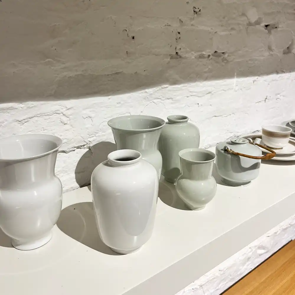 Die Vase Halle-Tee wurde von Marguerite Friedlaender-Wildenhain 1930 an der Burg Giebichenstein für KPM im Rahmen der Vasenserie Halle entworfen. Die Vase Halle-Tee war zusätzlich mit einer leichten anderen Mündung auch als Teedose mit einem versilberten Deckel damals erhältlich. Die hier angebotene Vase stammt aus den 1930er Jahren und veefügt über die seltene Craquelé-Glasur. Die Vase war Exponat unserer Ausstellung 2025 ”Im Zeichen der Burg” über das Werk von Marguerite Friedlaender-Wildenhain und die Zusammenarbeit mit der KPM vor 1939.