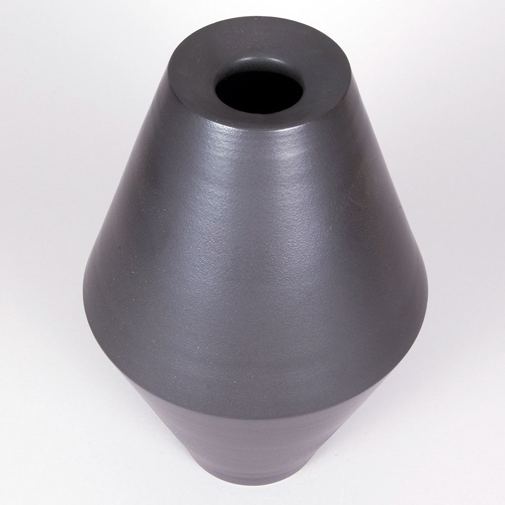 Die rautenförmige Vase von Lutz Könecke aus dem Jahr 2015 überzeugt durch ihre Reduktion, verbunden mit der Eleganz einer matten, schwarzen Glasur. Das Pendant dazu ist die höhere, spindelförmige Vase.