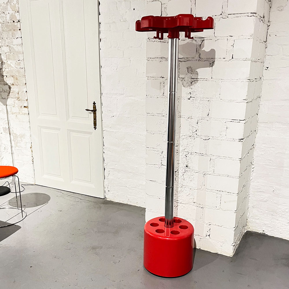 in den 1970er Jahren entwarfen Roberto Lucchi und Paolo Orlandini für die Firma Velca Legnano mit Sitz in Mailand diesen durchdachten Kleiderständer. Denn die sechs Löcher im Fuß dienen nicht nur zur Aufnahme von Regelschirmen sondern sind gleichzeitig als Verpackung für die sechs Metallrohre, die die Stange bilden, gedacht. Die Metallrohre können dabei einfach gesteckt werden - fertig ist so der Kleiderständer.