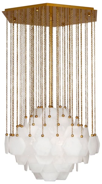 Die Formg des Vienna LÜsters von Jonathan Adler ist von Leuchten der Wiener Secession der Jahrhundertwende inspiriert. Die88 mundgeblasene, hexagonförmige Glaselemente bestehen aus Pulegoso-Glas und werden von den Ketten aus Messing gehalten. Bei der Pulegoso-Glastechnik werden die Luftblasen im Glas eingeschlossen, um eine undurchsichtige Lumineszenz zu erzielen. Passend zu den Glaselementen ist auch der gr0ße Lüster in der Form eines Hexagon.