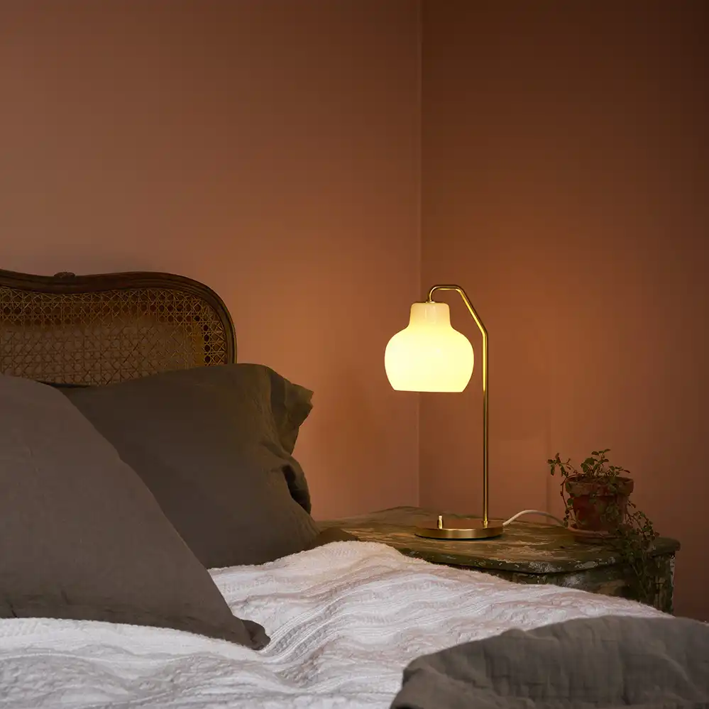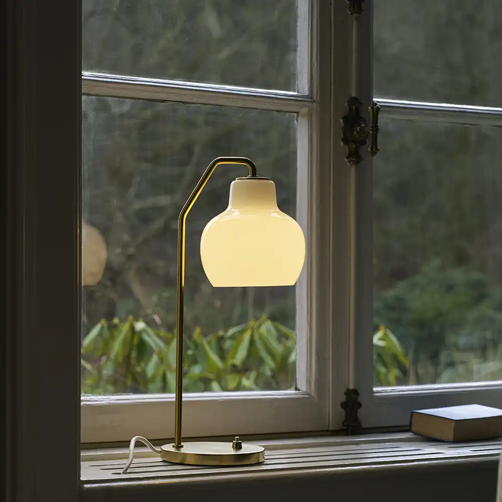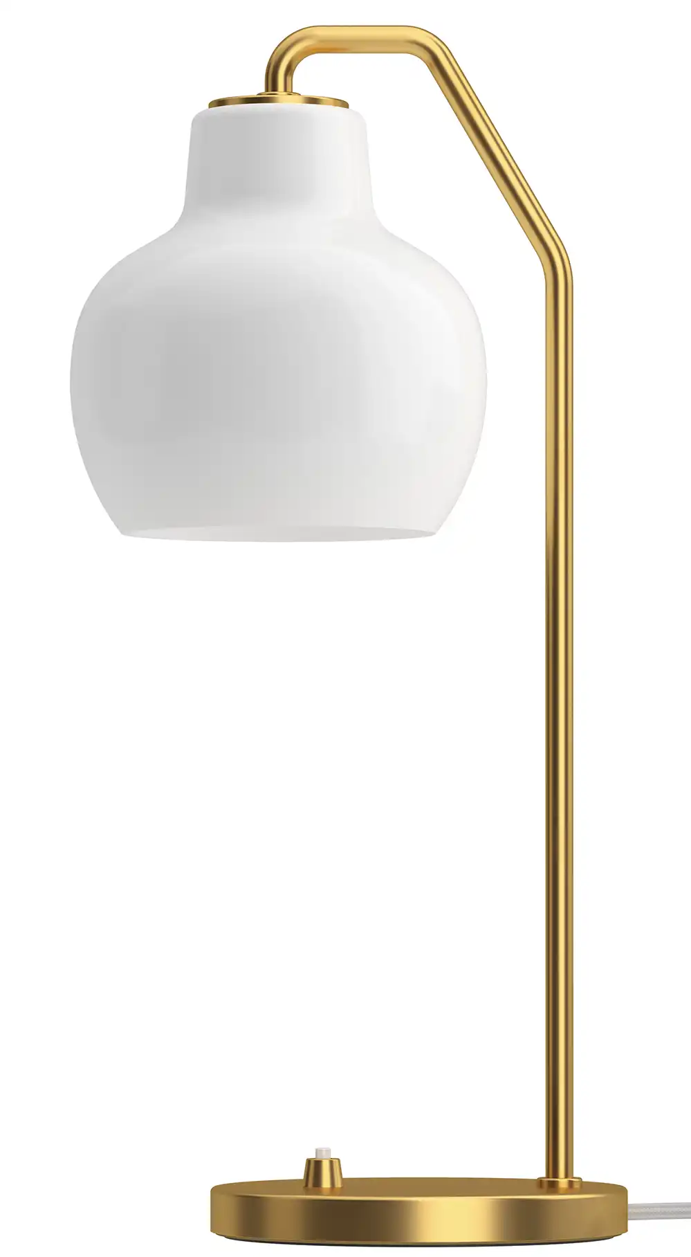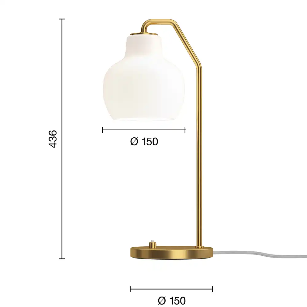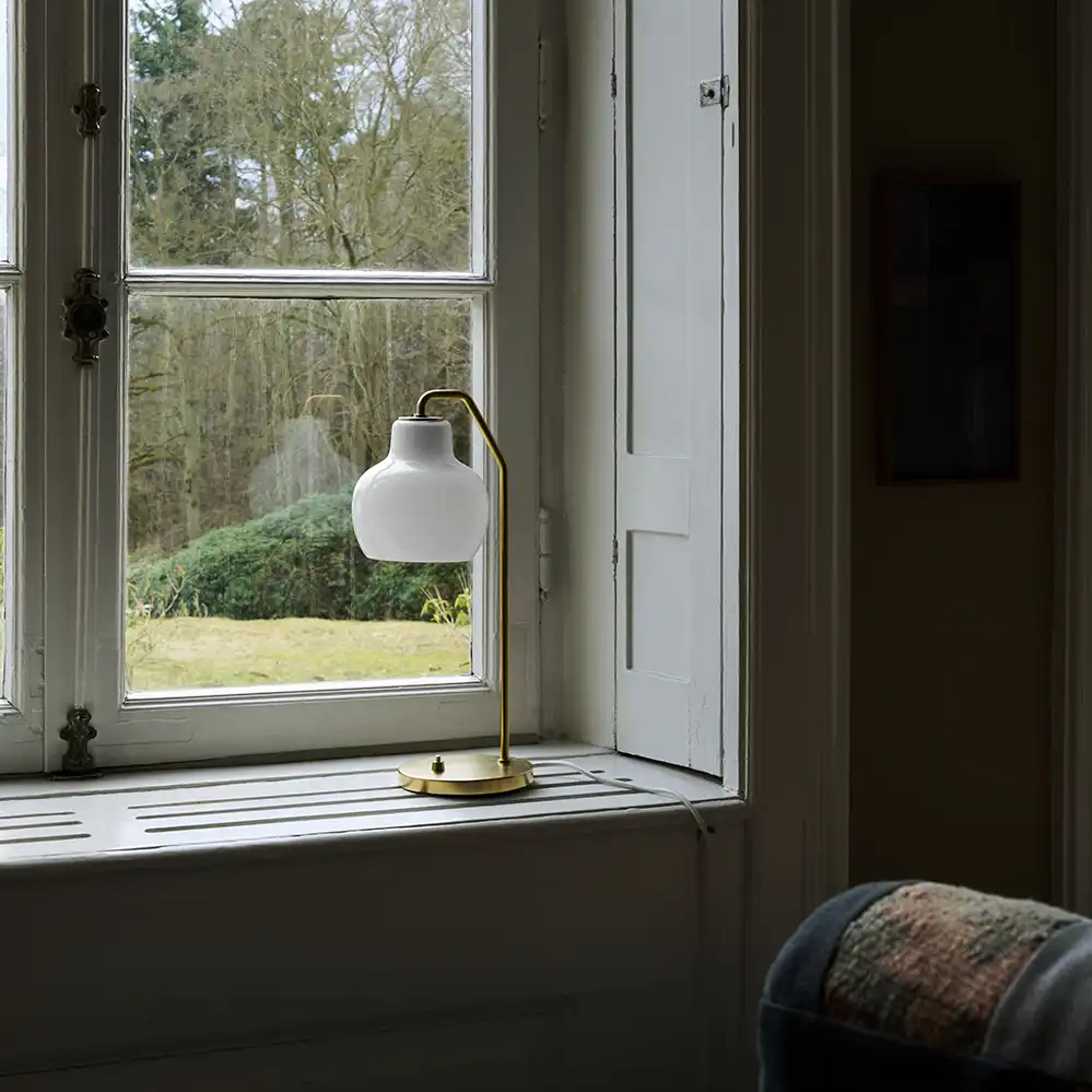 Die VL Ring Crown Tischleuchte ist Teil der Leuchtenserie, die der dänische Architekt und Designer Vilhelm Lauritzen in den 1940er Jahren für das Gebäude des dänischen Rundfunks in Frederiksberg entwarf. Ihr Design verbindet klassische Eleganz mit funktionaler Beleuchtung und schafft ein unverwechselbares Ambiente.Die Metallelemente bestehen aus unbehandeltem, poliertem Messing, das im Laufe der Zeit eine natürliche Patina entwickelt. Der blendfreie Schirm wird aus glänzend weißem, dreischichtigem und mundgeblasenem Opalglas gefertigt. Diese hochwertige Materialkombination sorgt für eine warme, gleichmäßige Lichtverteilung und unterstreicht den zeitlosen Charakter der Leuchte.