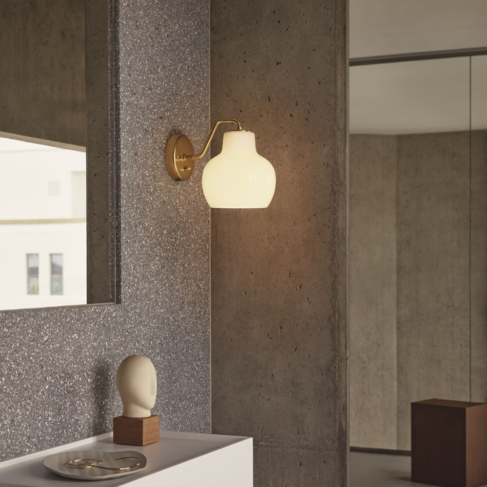 Die VL Ring Crown Wandleuchte ist Bestandteil der gleichnamigen Leuchtenserie von Louis Poulsen, das Design entwarf der dänische Architekt und Designer Vilhelm Lauritzen für das Rundfunkgebäude Radiohuset im Kopenhagener Stadtteil Frederiksberg. Gefertigt mit einer Basis aus unbehandeltem polierten Messing, besteht der blendfreie Glasschirm aus glänzend weißem, dreischichtigem und mundgeblasenem Opalglas, welches für eine warme Beleuchtung und ein stilvolles, unverwechselbares Ambiente sorgt. Die Serie besteht aus dem Kronleuchter, zwei Wandleuchten und einer Pendelleuchte. Der VL Ring Crown Wandleuchte ist in folgenden beiden Varianten erhältlich: