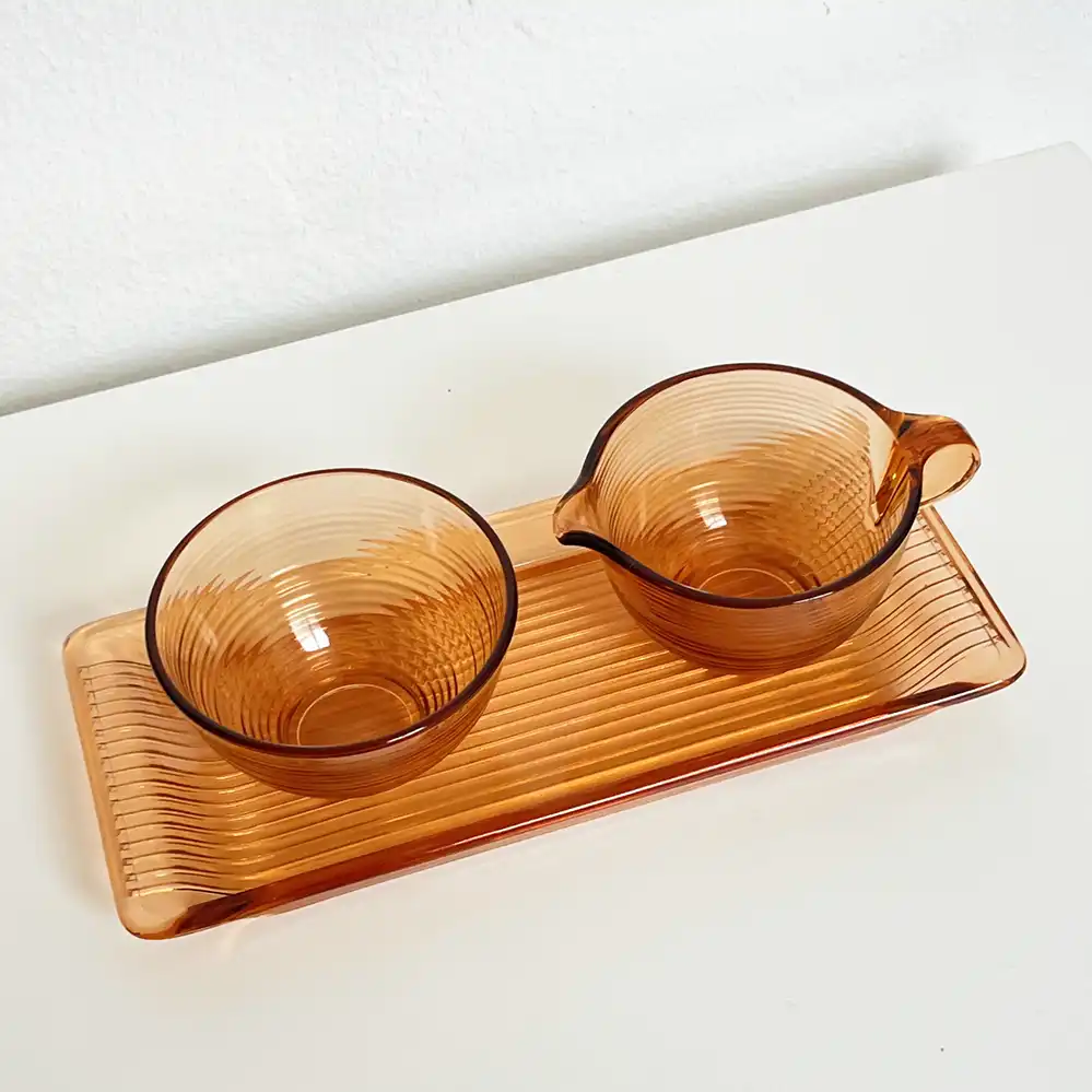 Das seltene Zucker- und Sahneservice von Wilhelm Wagenfeld stammt aus dem Jahr 1935/36 und basiert auf dem Pressglas der Heibronn Serie. Diese frühe Version ist noch ohne die spätere VLG-Rautenmarken.