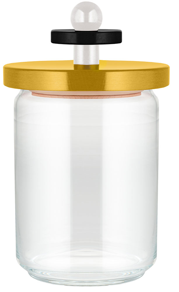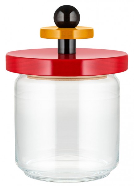 Der hermetisch verschließbare Vorratsbehälter ES16 wurde von Ettore Sottsass in den 1980er Jahren entworfen und im Rahmen des 100jährigen Firmenjubiläums von Alessi 2021 neu aufgelegt. Das untere Element des Vorratsbehälters besteht aus Glas, der verschießbare Deckel ist aus Buchenholz. Erhältlich ist der Vorratsbehälter in zwei Größen und zwei Farben.
