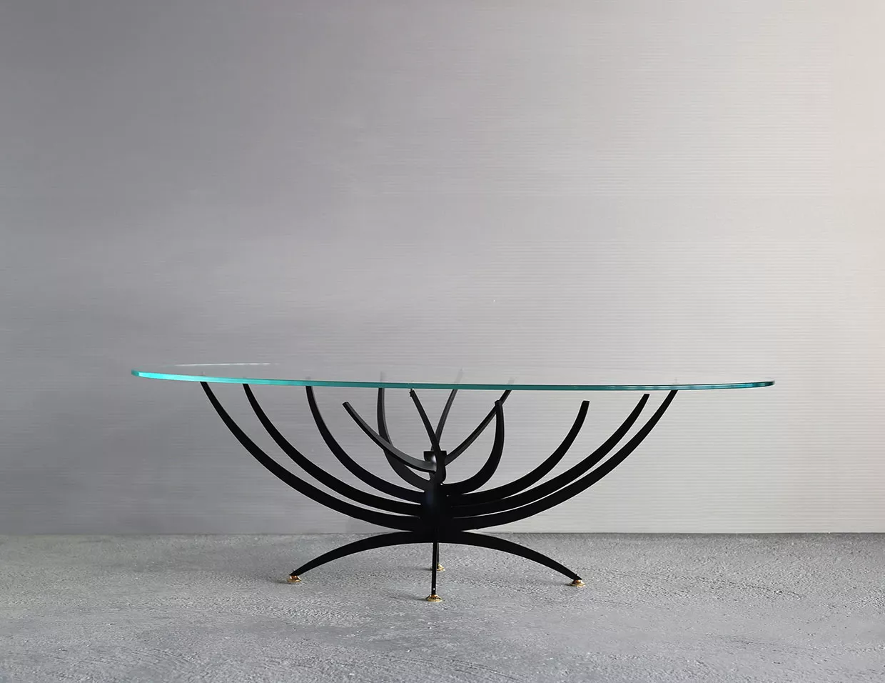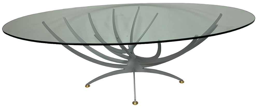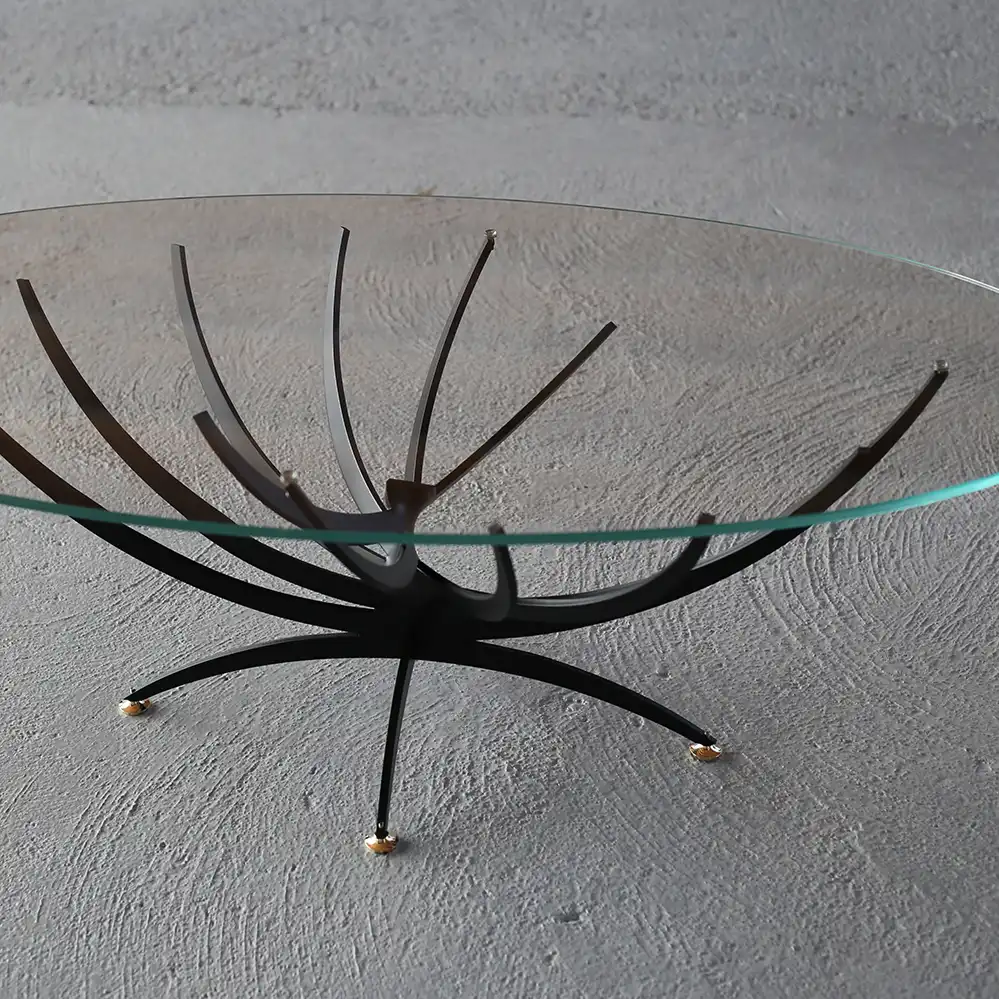 Serge Mouille ist vor allem als Entwerfer der berühmten Leuchtenserie bekannt, sein Werk ist aber vielseitiger. Sio entwarf Mouille im Jahr 1962 den Vrillée Couchtisch im Stil des Brutalismus, das Original befindet sich immer noch im Familienbesitz. 2024 beschloss die Familie, den Klassiker neu aufzuleben. Das Stahlgestell ist wahlweise grau oder schwarz lackiert, die Tischplatte aus Glas. Die letzte Abbildung zeigt den historischen Tisch.