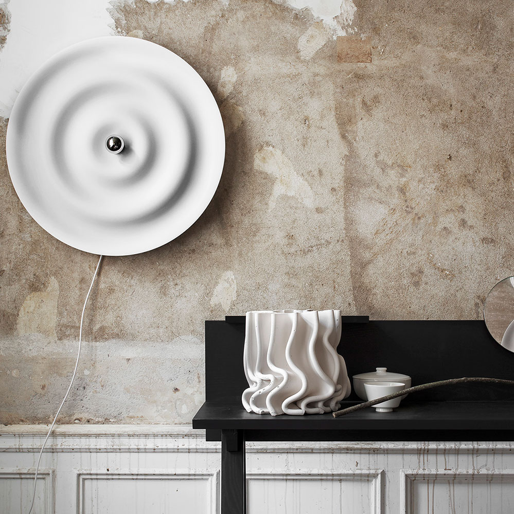Die wellenförmige und nur 2 cm flache w171 Alma Leuchte ist bei Wästberg wahlweise als Pendelleuchte, Deckenleuchte oder Wandleuchte verfügbar, der Entwurf aus dem Jahr 2017 stammt von dem schwedischen Studio Tham & Videgård. Lieferbar in Aluminium, hellgrau oder weiß pulverbeschichtet.