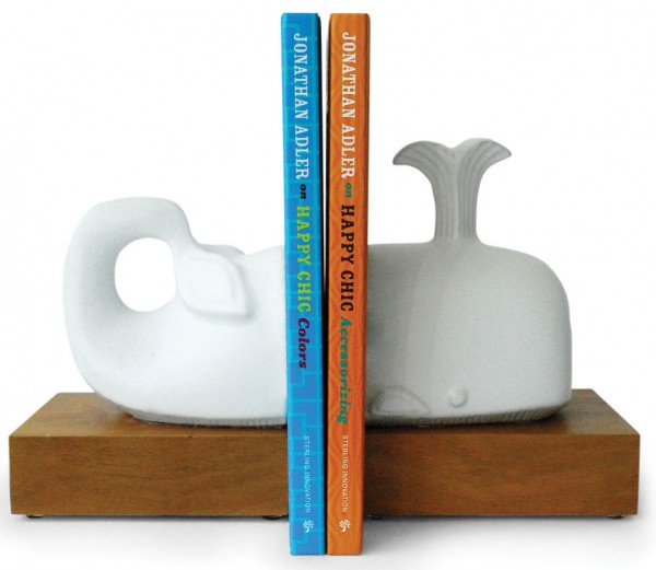 Die zwei Buchstützen in Form eines Walfischs zählen der Menagerie Kollektion von zu Jonathan Adler, wo Tiere als Keramiken umgesetzt werden.