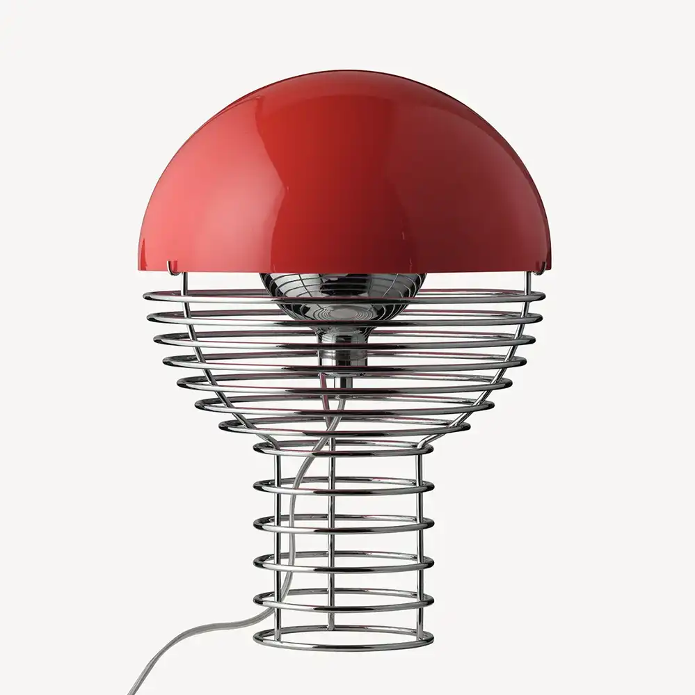 Die Tischleuchte Wire Lamp ist ein Entwurf von Verner Panton aus dem Jahr 1972 und besticht durch das Konstruktionsprinzip. Der Lampenfuß besteht aus verchromten Metalldraht, ein Material, das Panton immer wieder gerne verwendete, wie bei den Entwürfen seines Drahtregal oder den Sitzmöbeln für Fritz Hansen.