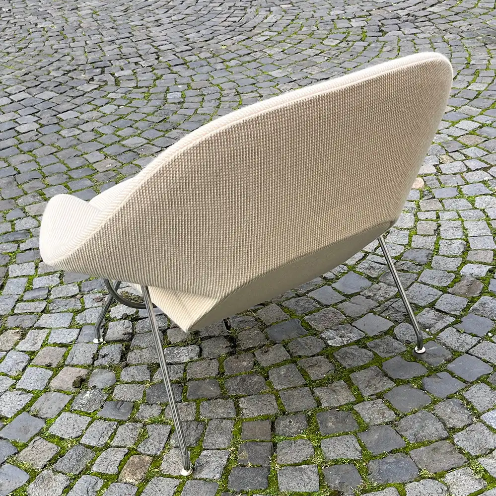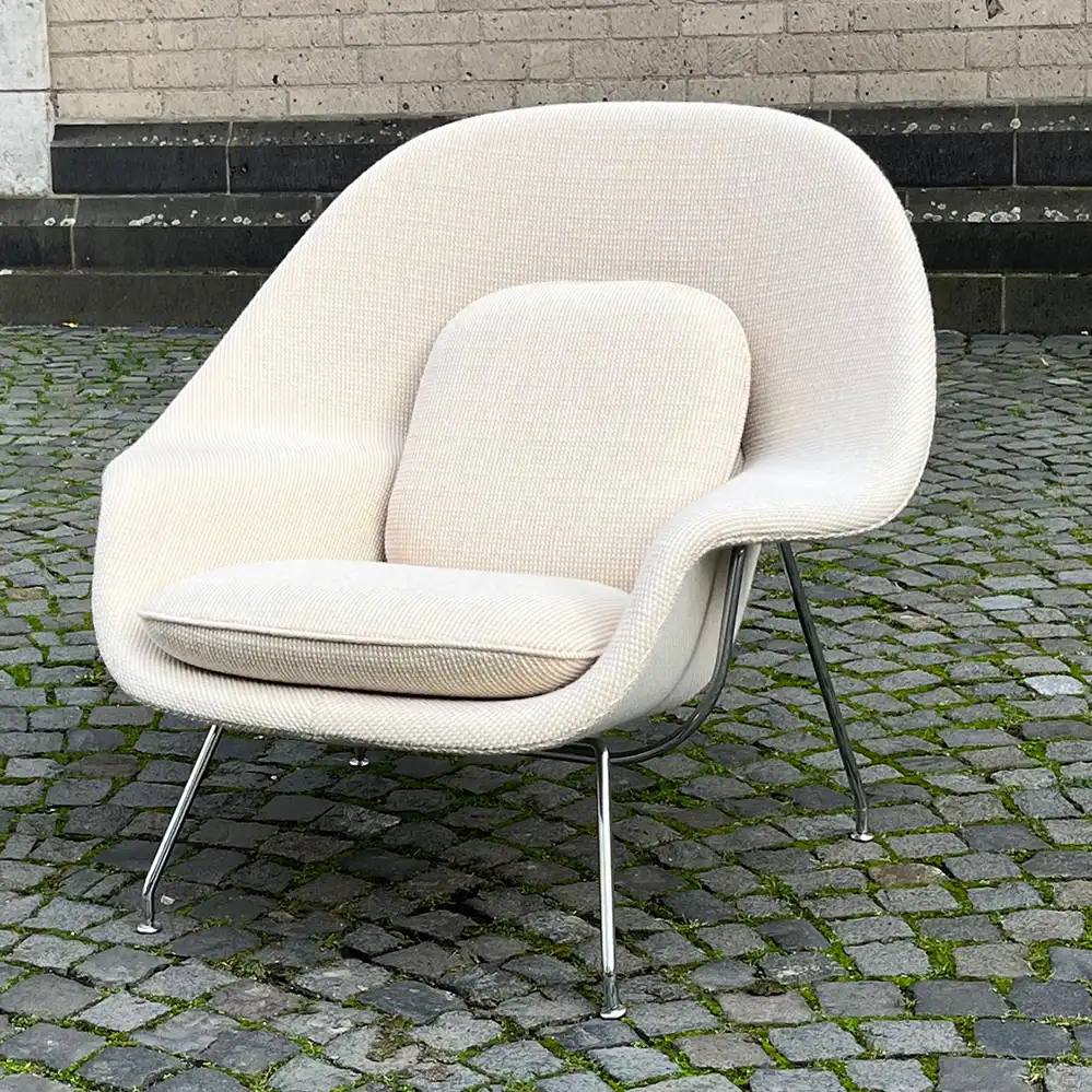 1948 stellte Florence Knoll Eero Saarinen die Aufgabe, einen Sessel zu entwerfen, in dem man sich „wie ein Baby zusammenrollen kann”. Heraus kam der legendäre Womb Chair, der erste Sessel mit einer formgepolsterten Kunststoffschale. Dabei griff Saarinen konzeptionell auf frühere Arbeiten zurück, die er gemeinsam mit Charles Eames Anfang der 1940er Jahre für den Organic Chair entwickelte. Saarinen war der Sohn von Eliel Saarinen, dem bedeutendsten Architekten Finnlands. Nachdem die Saarinen Familie Ende der 1920er Jahren in die USA auswanderte, wurde Eliel Saarinen der erste Direktor der Cranbrook Academy (die amerikanische Antwort auf das Bauhaus), wo unter anderem Florence Knoll oder Harry Bertoia studierten. Die Cranbrook Academy gilt heute als die Wiege des amerikanischen Mid Century Designs. In diesem Umfeld lernte Eero Saarinen auch Charles Eames kennen und arbeitete mit ihm freundschaftlich eng zusammen. Während Eames sich auf das Möbeldesign konzentrierte, wurde Eero Saarinen dagegen ein bedeutender Architekt - mit dem TWA Terminal in New York und der Arch in St. Louis schuf er zwei amerikanische Architekturikonen. Früh entstand auch seine enge Freundschaft mit Florence Knoll, die in den 1930er Jahren quasi von der Saarinen Familie adoptiert wurde und später eine enge Auftraggeberin des Architekten wurde. Für Knoll entwarf Eero Saarinen mit dem Tulip Chair später den ersten einarmigen Stuhl weltweit und schrieb so Designgeschichte.