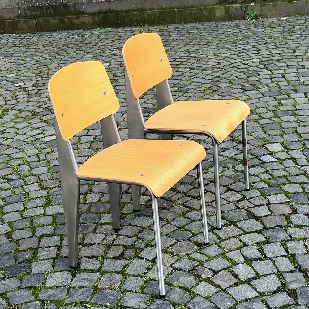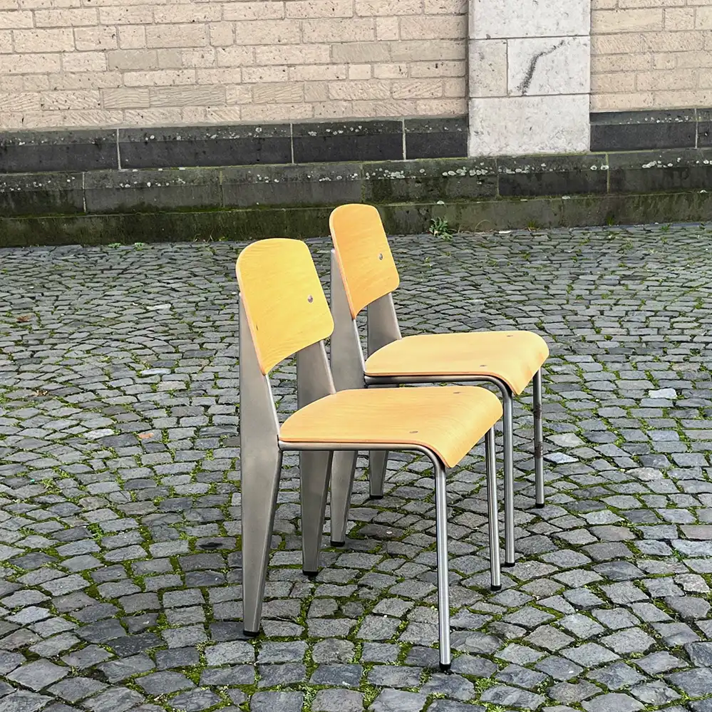 Der Standard Chair Brut wurde von Vitra nur ganz kurz produziert und direkt wieder eingestellt. Hintegrund war, dass die silberfarbige Lackierung schnell oxidiert und Patina entwickelt, was aber nach unserer Meinung eigentlich zu den Standard Chair von Jean Prouvé passt. Daher haben wir auch die wohl letzten beiden Stühle gerne übernommen, Preis pro Stuhl