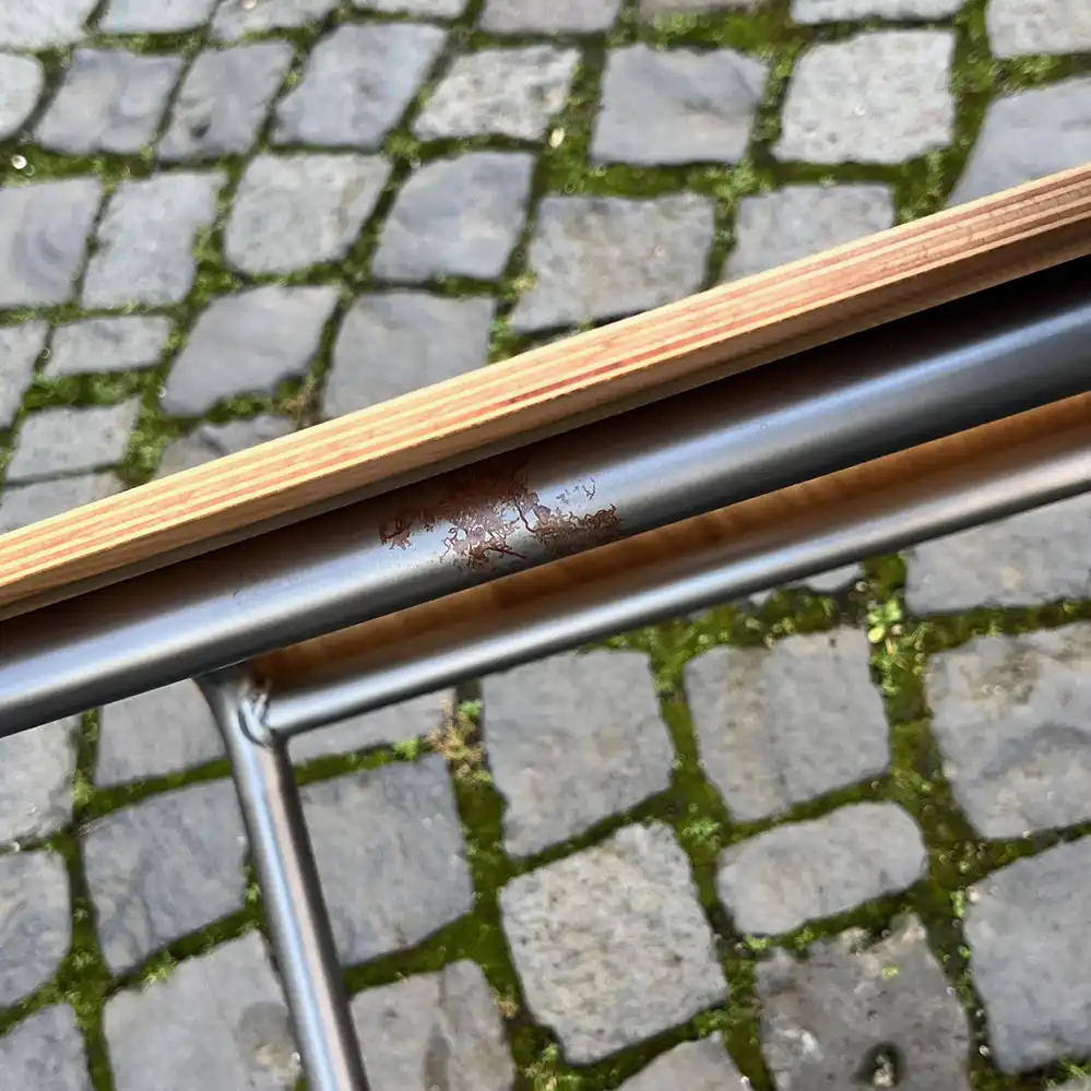 - Untergestell aus Stahlblech und Rundrohr, silberfarbig pulverbeschichtet, bereits mit Oxidationsspuren