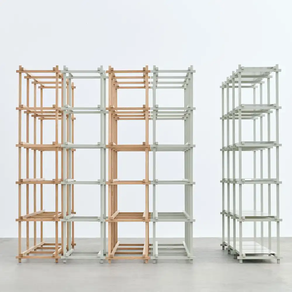 Woody Shelving High ist ein offenes Regalsystem mit klarer, minimalistischer Formensprache. Die Konstruktion legt bewusst die Verbindungselemente offen und kombiniert einen stabilen Holzrahmen mit Regalböden aus pulverbeschichtetem Stahl oder gehärtetem Glas. Die hohe Version bietet großzügigen Stauraum und eignet sich ideal zum Präsentieren oder Organisieren von Gegenständen in Wohn- und Arbeitsbereichen. Das Regal ist folgenden Variationen erhältlich: