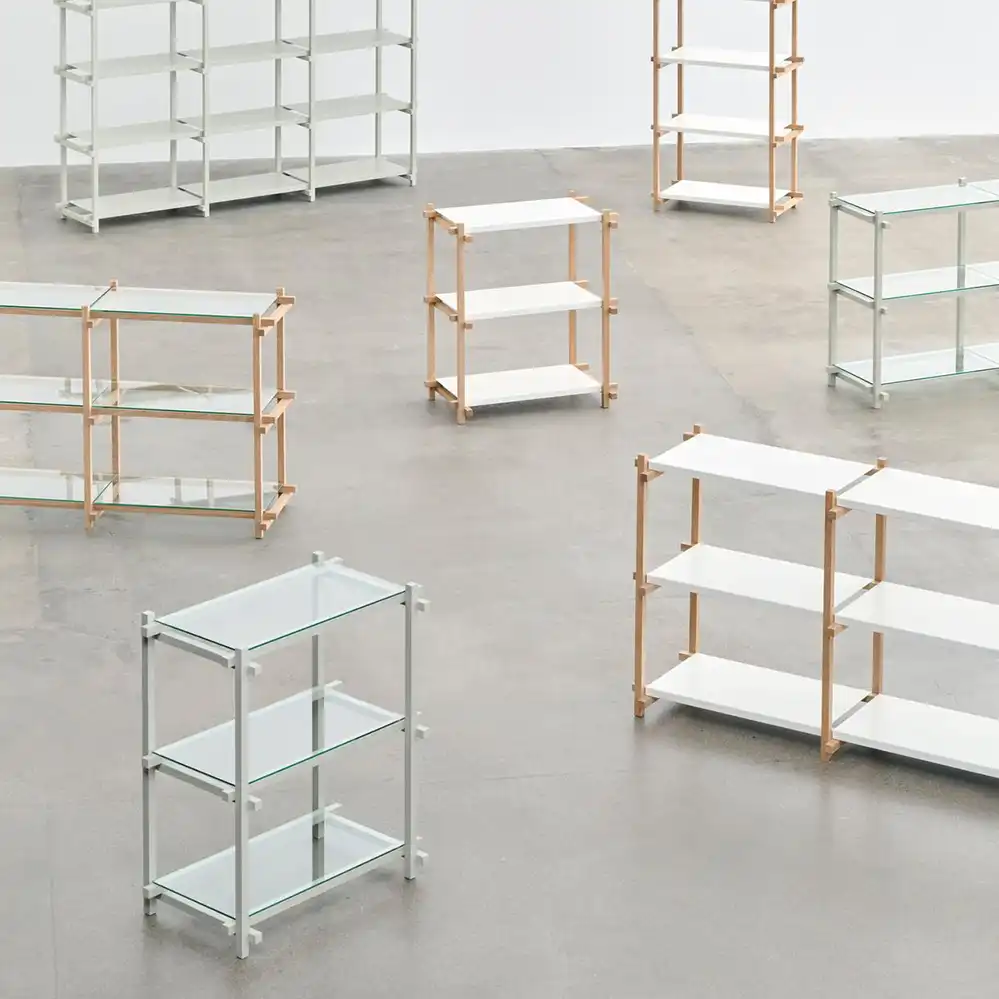 Woody Shelving Low ist ein funktionales und minimalistisches Regalsystem, das Ästhetik und Praktikabilität vereint. Die offene Konstruktion sorgt für leichte Zugänglichkeit und gute Übersicht, ideal zum stilvollen Präsentieren oder ordentlichen Verstauen von Gegenständen. Das Regal besteht aus einem soliden Holzrahmen, kombiniert mit pulverbeschichteten Stahl- oder gehärteten Glasböden. Das Regal ist folgenden Variationen erhältlich: